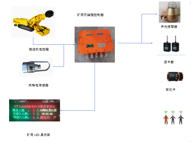 4、非法闖入指定區(qū)域(例如距離掘進(jìn)機(jī)尾部3米處)實(shí)現(xiàn)報(bào)警并在LED屏顯示